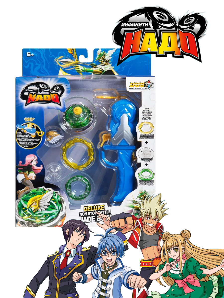 В наборе: аватар Надо, защитное кольцо, атакующее кольцо, наконечник, волчок, магнитная пусковая установка, монтажный инструмент, инструкция на русском языке.