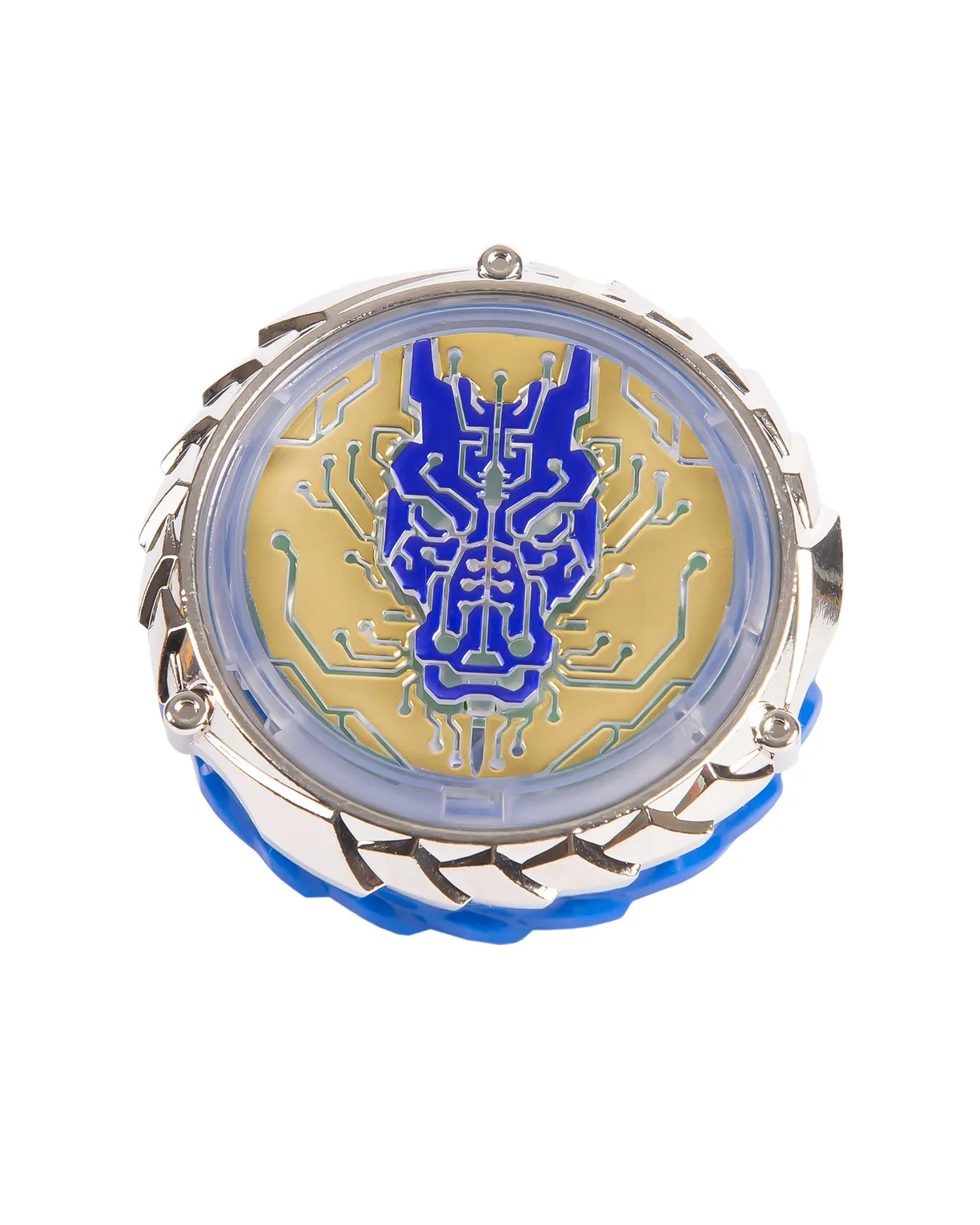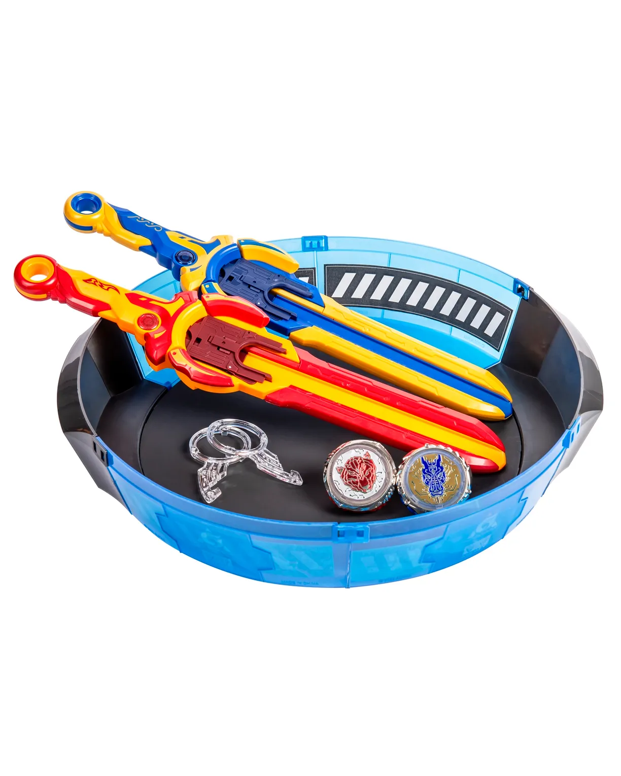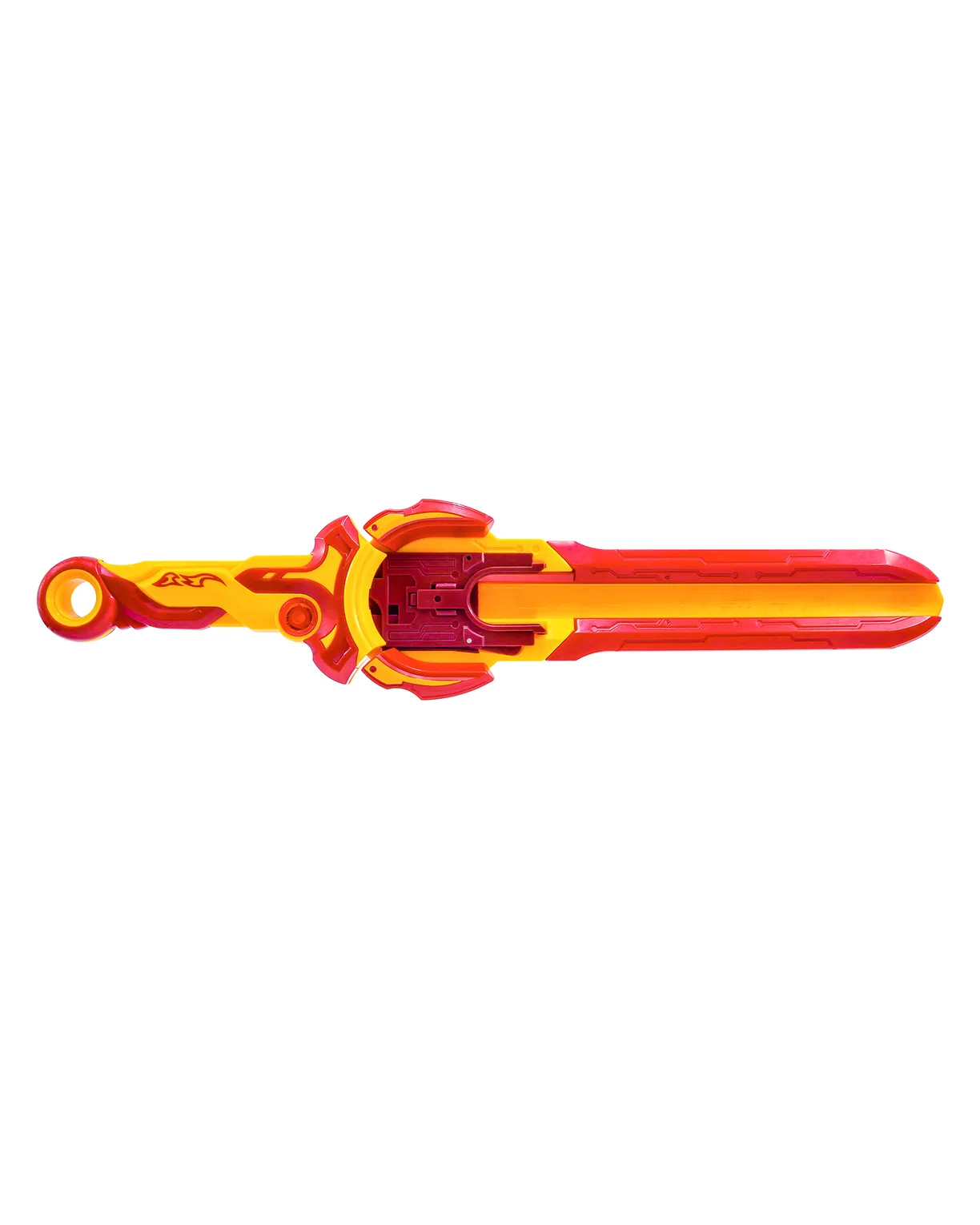 - вставь Надо в специальное отверстие до щелчка, раскрути волчок с помощью ножен, нажми кнопку запуска и запусти на сборную арену для эпичных баттлов
