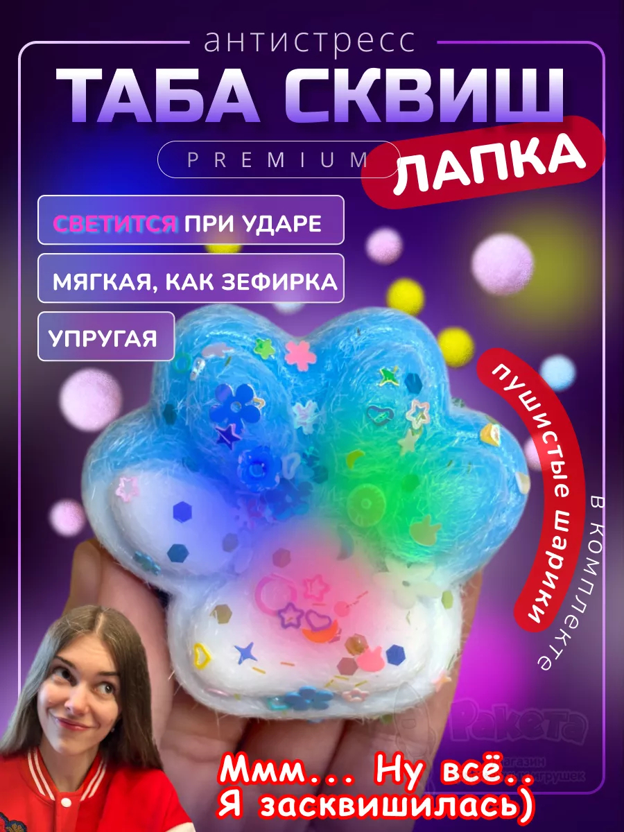 - Антистресс игрушка Таба сквиш лапка с флоком светящаяся