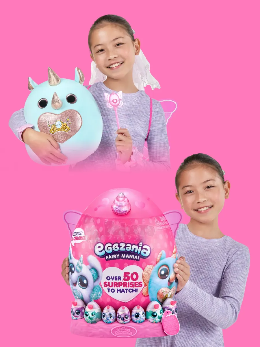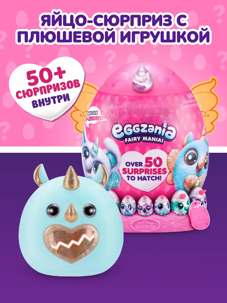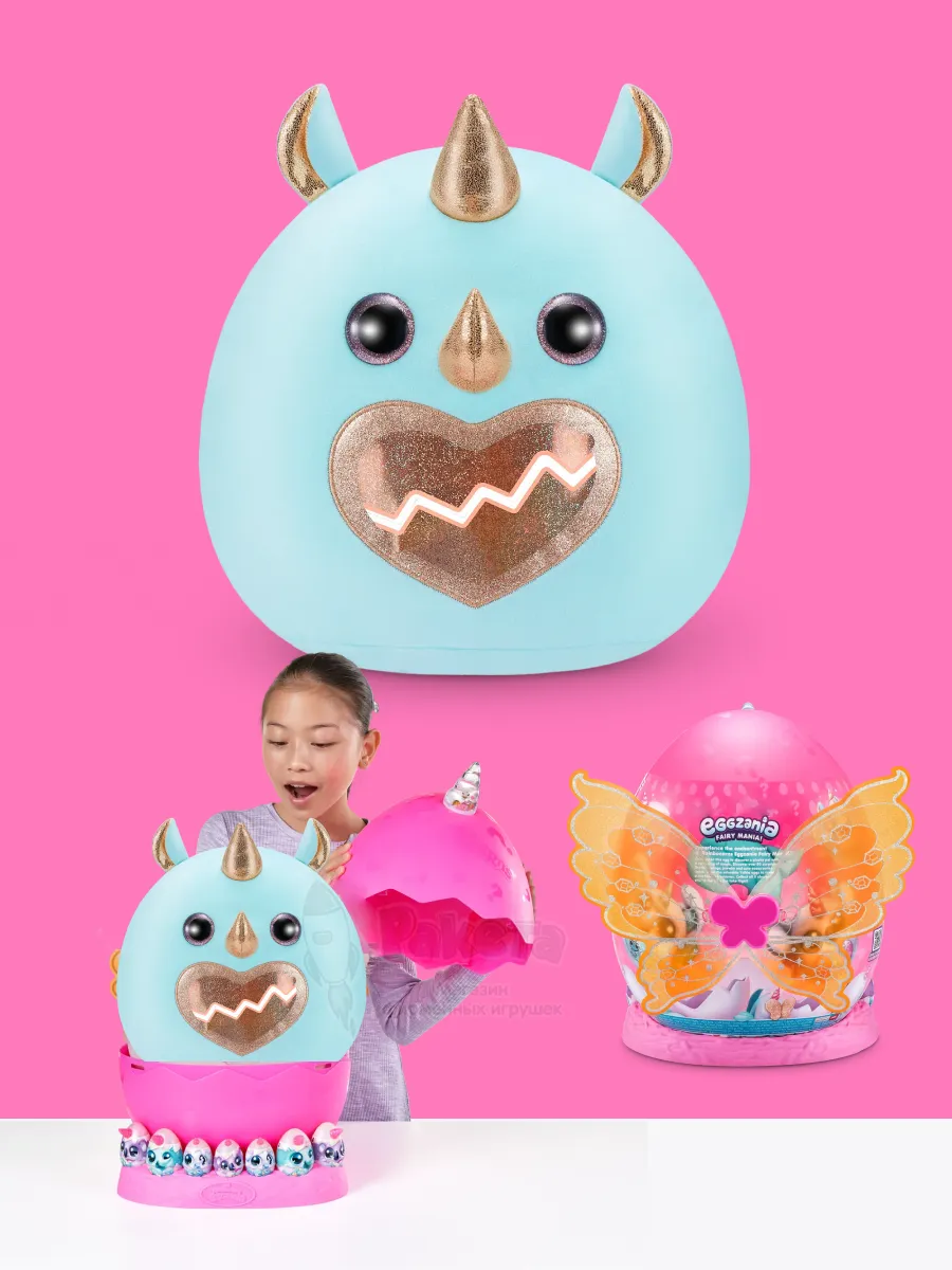 Внутри яйца можно найти более 50 сюрпризов, из которых мягкая игрушка единорожка с блестящим рогом и животиком, очаровательные крылья, роскошные ленты для волос, браслеты из бисера, повязки и прочие аксессуары.