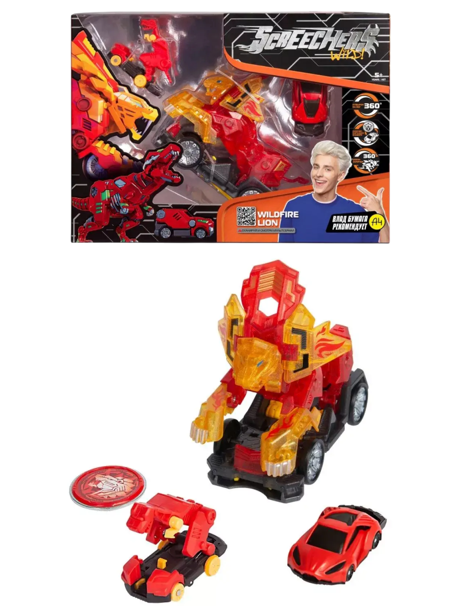 В комплекте: машинка-трансформер, усиленный энергетический диск, скричер-кар, мини-скричер, коллекционная карточка, инструкция