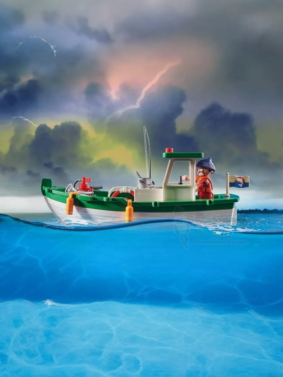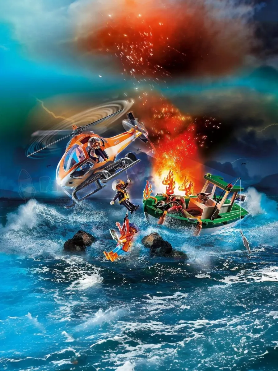 Набор Playmobil Rescue Action Миссия береговой пожарной службы - это увлекательный игровой набор для детей. Тут разыграна ситуация где на лодке вспыхнул пожар и спасатели спешат на помощь. У вертолета есть лебедка по которой спасатель может спуститься, что бы спасти капитана закрепив в спасательной люльке. Лодка может плавать в воде.