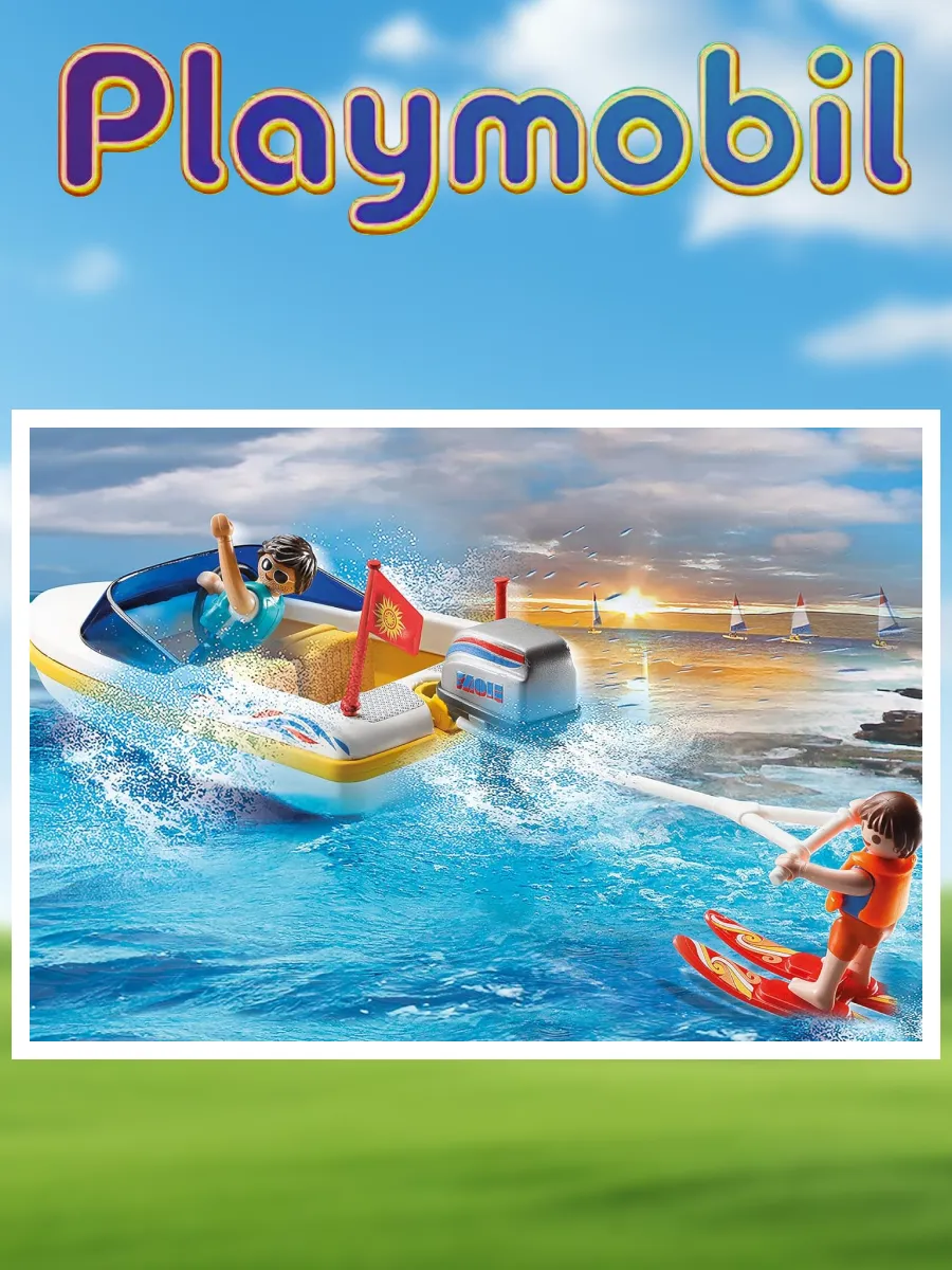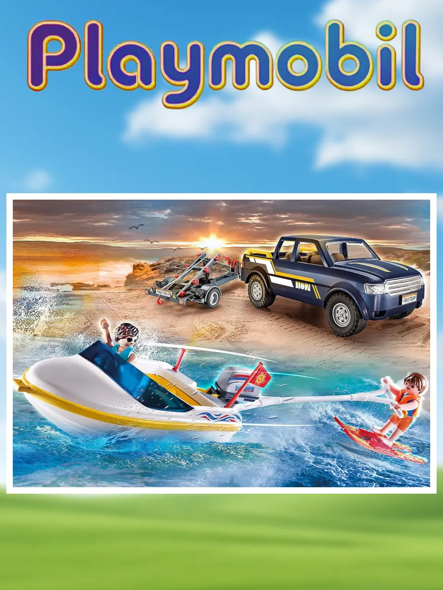 В набор входят две фигурки, пикап, скоростной катер, лодочный прицеп, доска для серфинга, пляжные сумки и другие аксессуары.