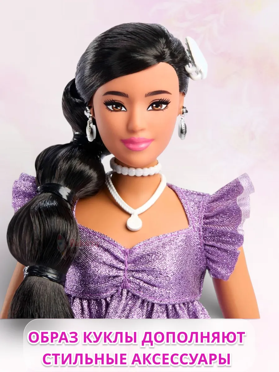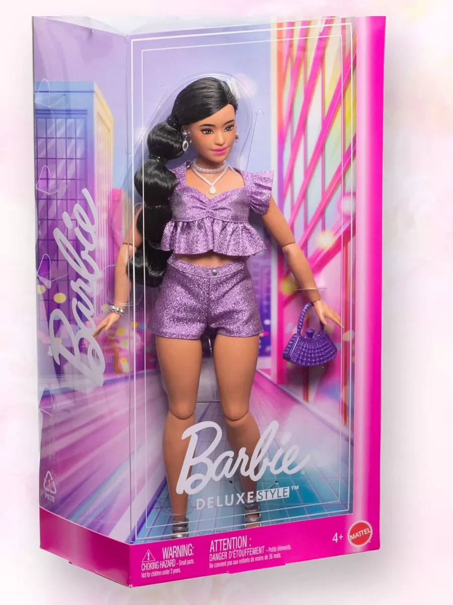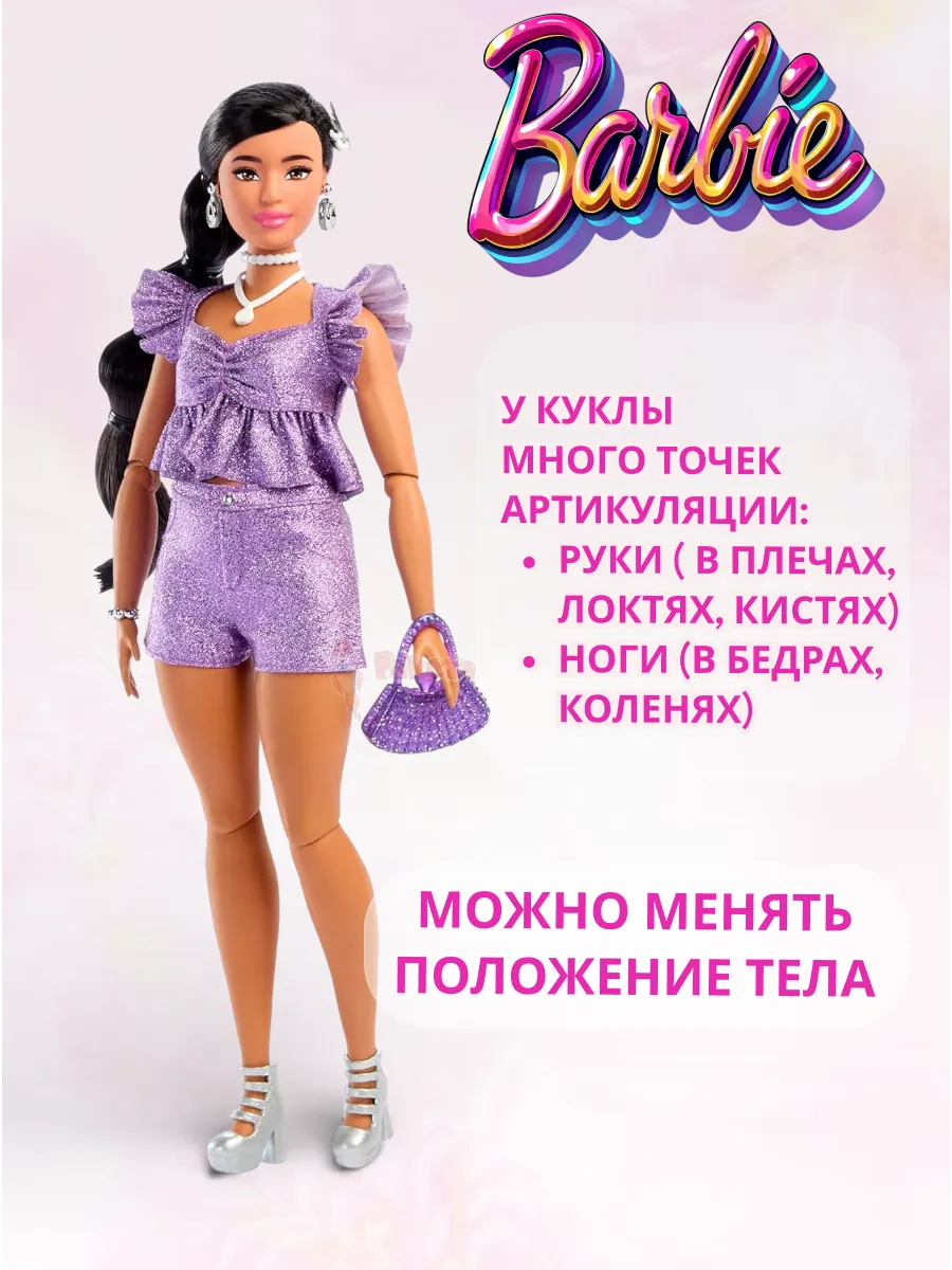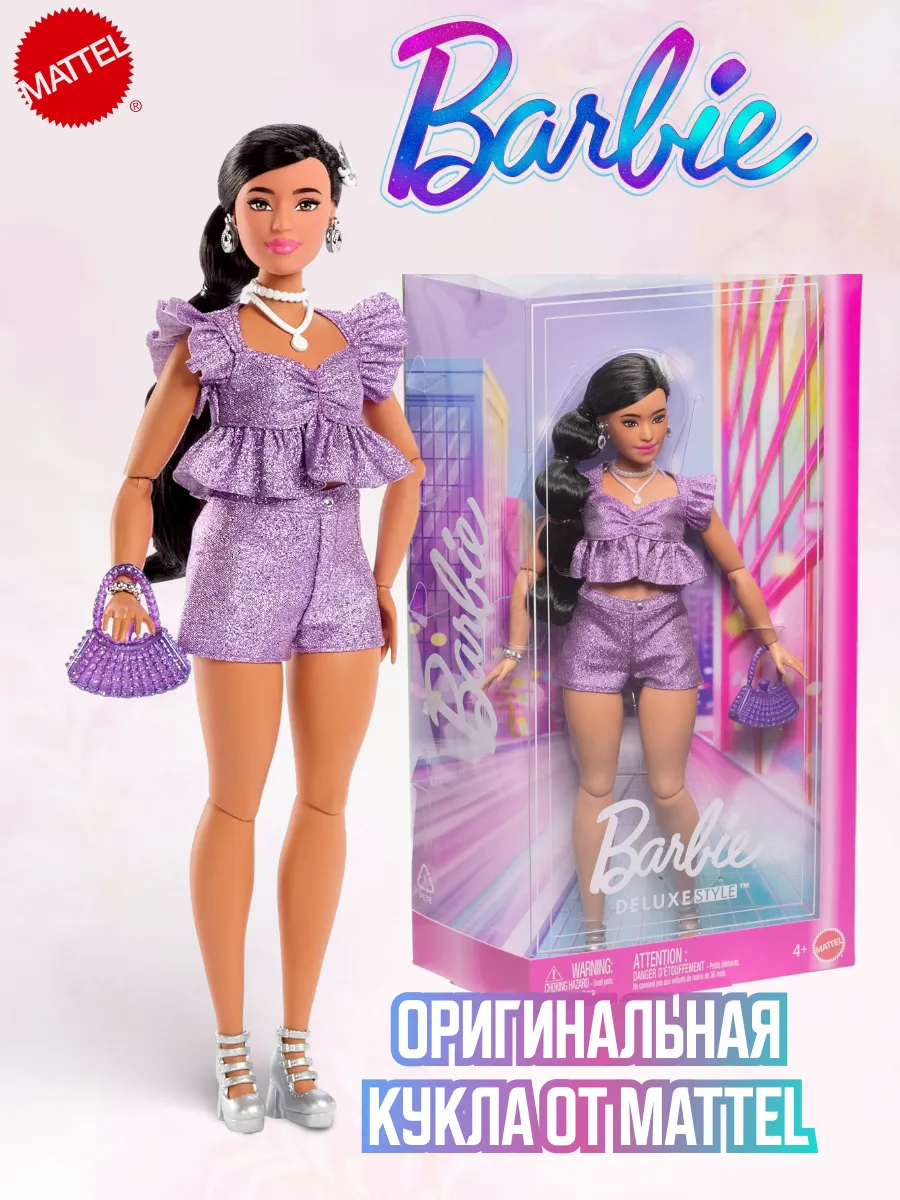 100% оригинал. Barbie Deluxe Style 1 серия от оригинального бренда Mattel. Серия выполнена в фирменных розовых цветах бренда. У куклы длинные черные волосы заплетенные в хвост. Одета в костюм из люрекса в фиолетовом цвете, состоящий из топа и шортиков. Образ дополняет сумочка, украшения, и серебряные туфли.