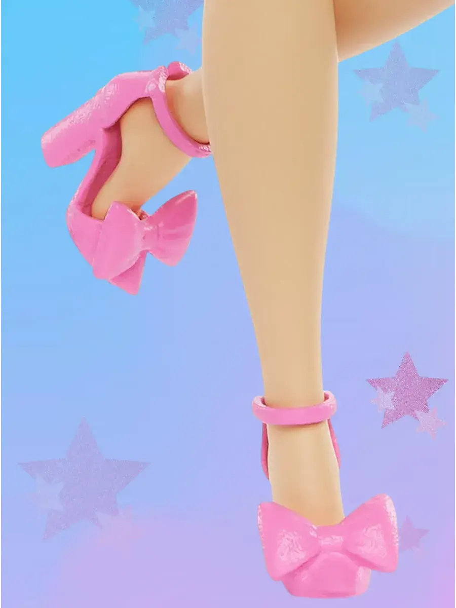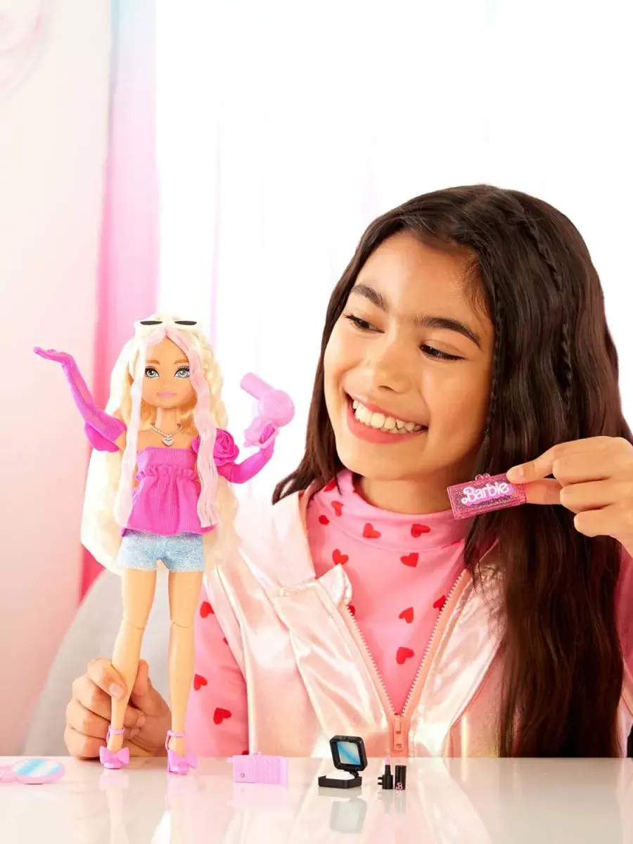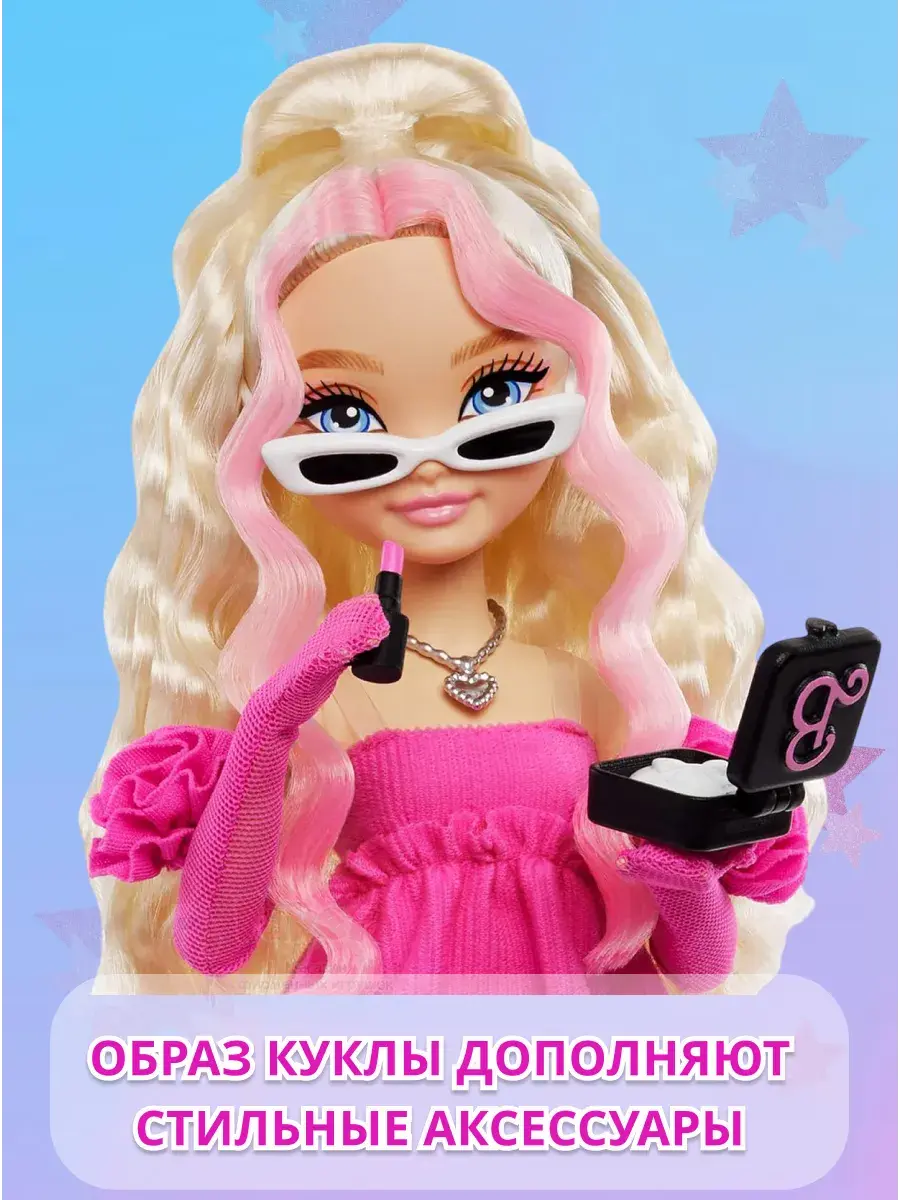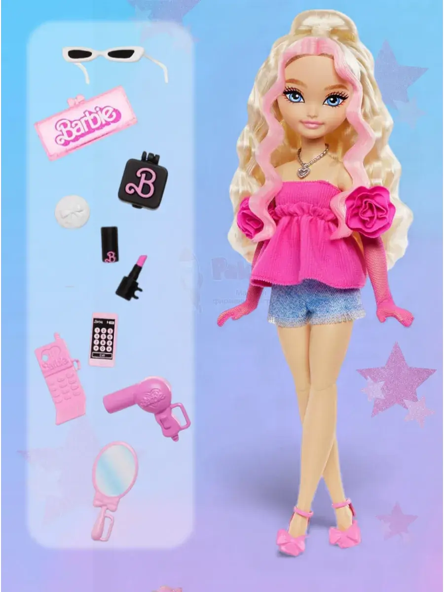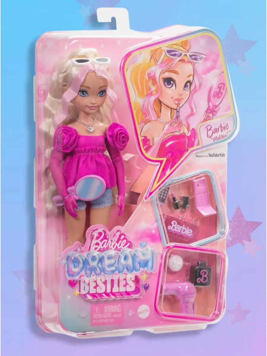 В комплекте: 1 кукла Barbie Dream Besties Barbie «Malibu», 1 розовое платье, 2 топа, 1 джинсовая куртка, 1 юбка, 1 джинсовые брюки, 1 ковбойская шляпа, 1 пара серёг, 1 ожерелье, 1 шарф, 1 телефон, 1 чехол для телефона, 1 палитра для макияжа, 2 пары обуви, 1 солнцезащитные очки, 2 сумки, 1 флакон духов, 1 ремень. Кукла не может стоять отдельно.