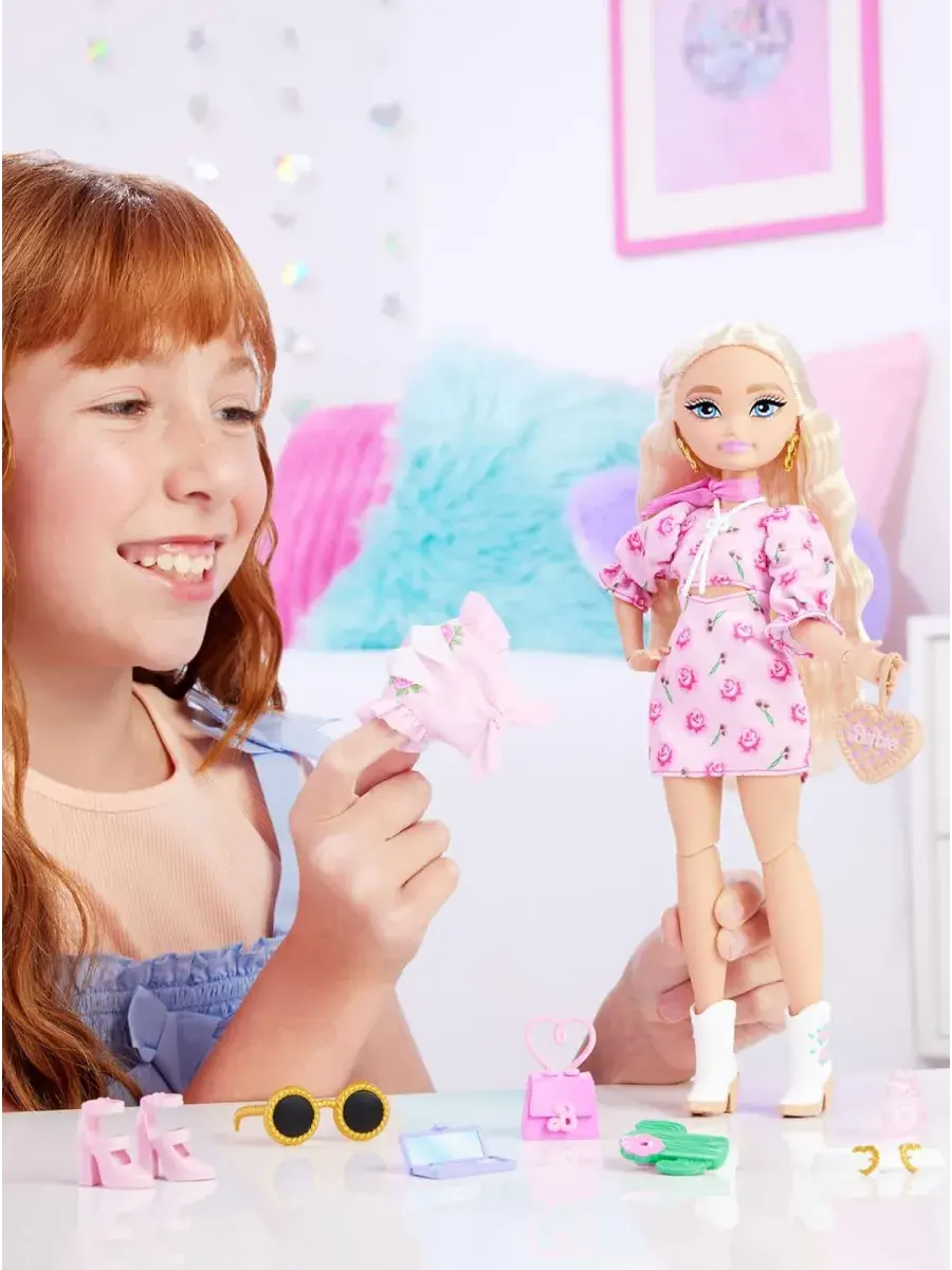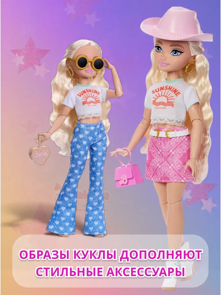 В комплекте: 1 кукла Barbie Dream Besties Barbie «Malibu», 1 розовое платье, 2 топа, 1 джинсовая куртка, 1 юбка, 1 джинсовые брюки, 1 ковбойская шляпа, 1 пара серёг, 1 ожерелье, 1 шарф, 1 телефон, 1 чехол для телефона, 1 палитра для макияжа, 2 пары обуви, 1 солнцезащитные очки, 2 сумки, 1 флакон духов, 1 ремень. Кукла не может стоять отдельно.