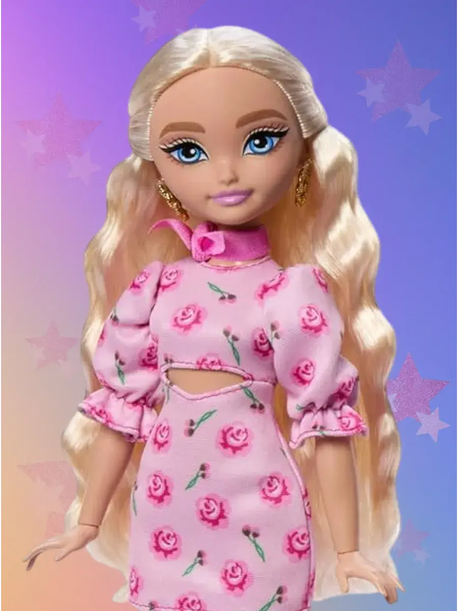 У куклы вьющиеся волосы. С куклой можно собрать много потрясающих образов.