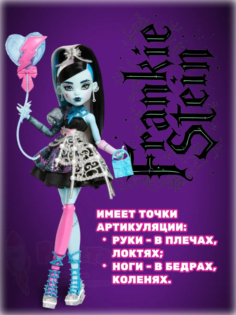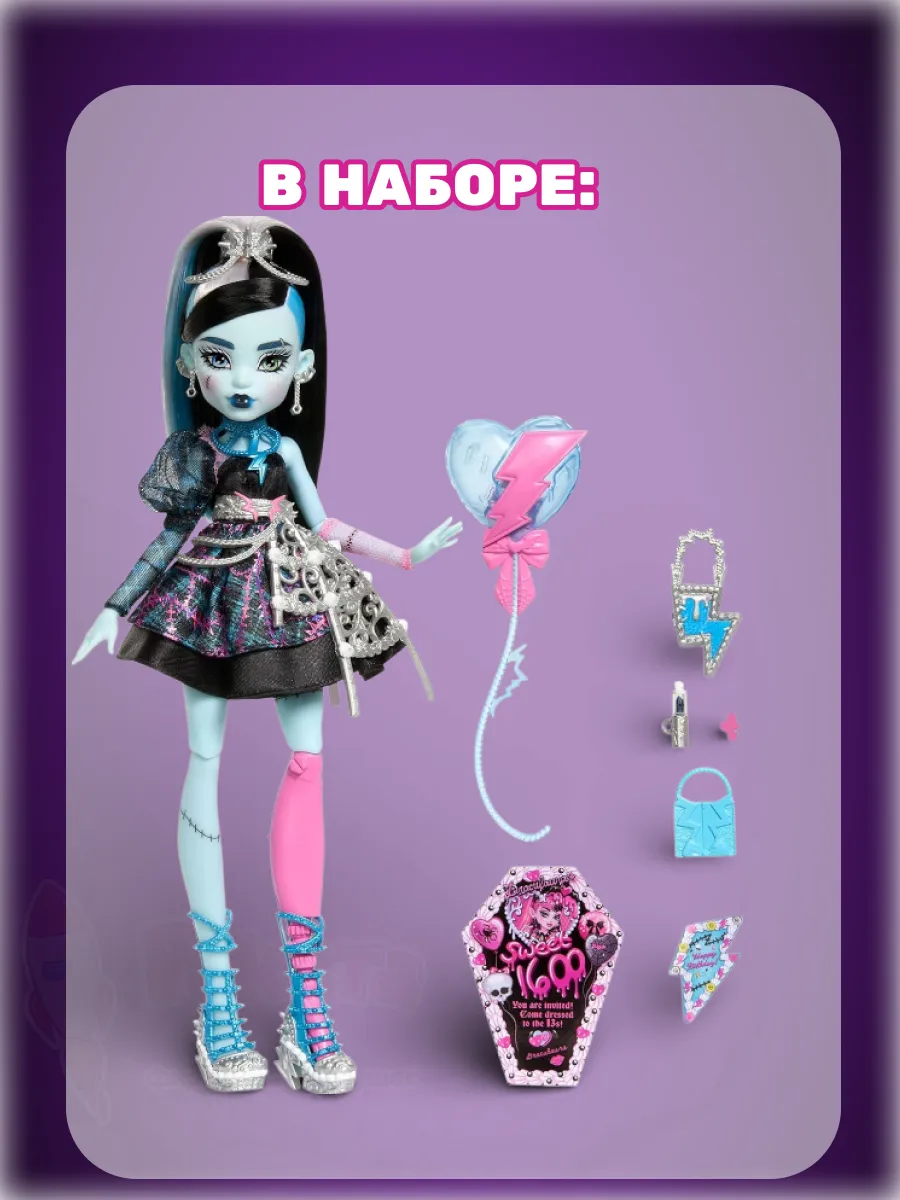 В наборе:1 кукла Фрэнки Штайн, 7 аксессуаров, подставка для куклы.