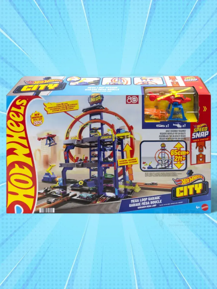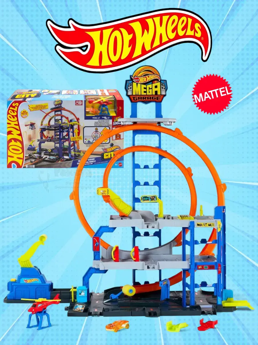 100% оригинал! Автотрек Hot Wheels Гараж с мега петлей - это захватывающий подарок для юных любителей Хот Вилс! Это увлекательный набор включающий в себя многоуровневый гараж и трек. Парковка включает в себя около 36 парковочных мест. На первом уровне есть мойка с мягкими поролоновыми валиками, на втором уровне расположилась заправочная станция, на третьем - автомастерская. Сбоку есть подъемник для машин на разные этажи. А так же есть вертолет, для эвакуации машин и специальная площадка для него.