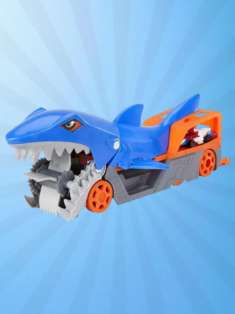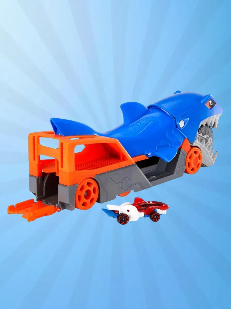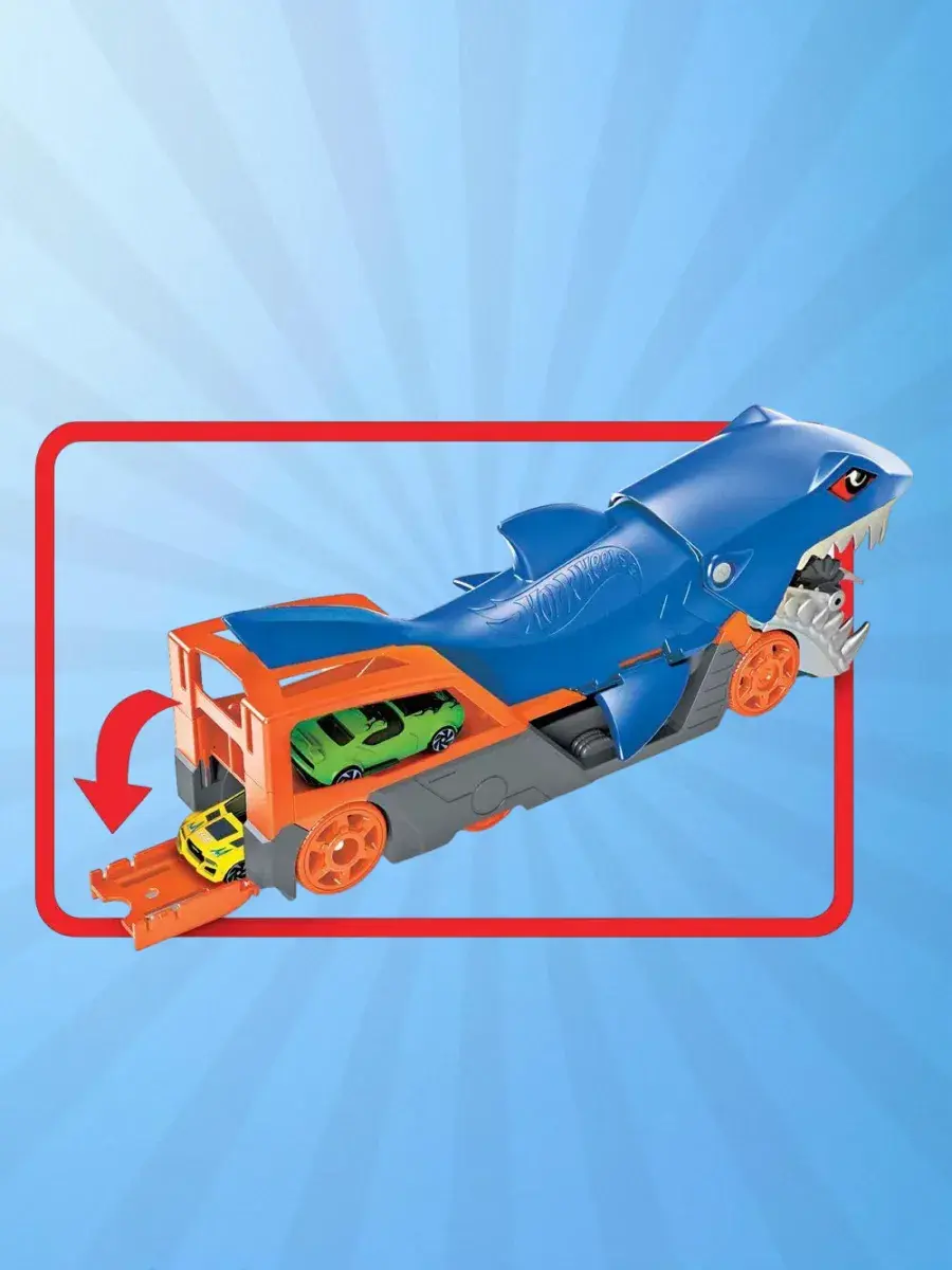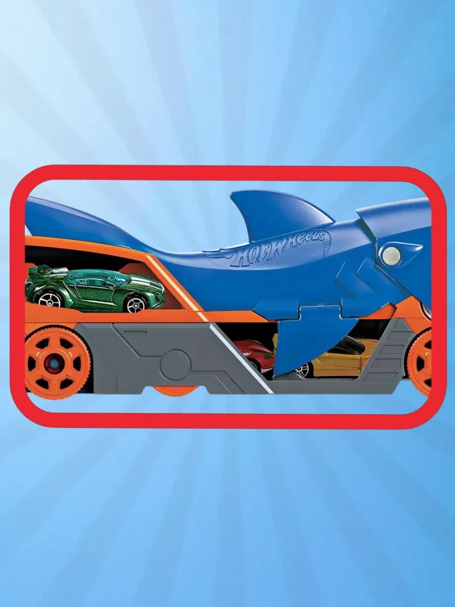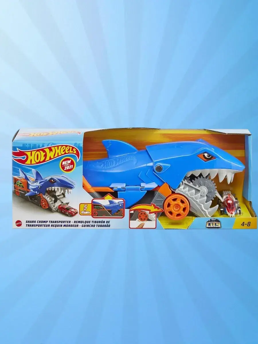 100% оригинал! Автотрек Hot Wheels Голодная акула - это захватывающий подарок для юных любителей Хот Вилс! Этот красочный автовоз с синим дизайном позволит ребенку устроить захватывающие гонки с машинкой Hot Wheels, включенной в комплект. Транспортер представляет собой автовоз в виде акулы, который "съедает" машинки. Так же внутри акулы есть парковочные места для перевозки автомобилей. Набор станет отличным подарком для мальчика на день рождения, Новый год или 23 февраля.