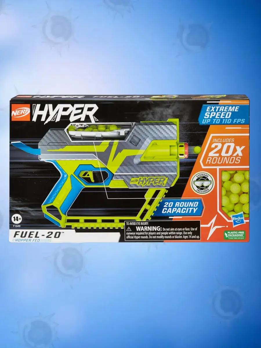 100% оригинал. Бластер Nerf Hyper Fuel 20 - это отличный выбор для активных игр и развлечений. Этот бластер стреляет пулями-шариками, обеспечивая безопасный и увлекательный игровой процесс. Бластер имеет бункерную подачу патронов куда вмещается 20 штук. Комплект включает в себя бластер, инструкцию, защитные очки и 20 стрел, что позволит вам сразу же начать игру. Nerf станет отличным подарком для друга, брата или ребенка на день рождения, 23 февраля или просто так.