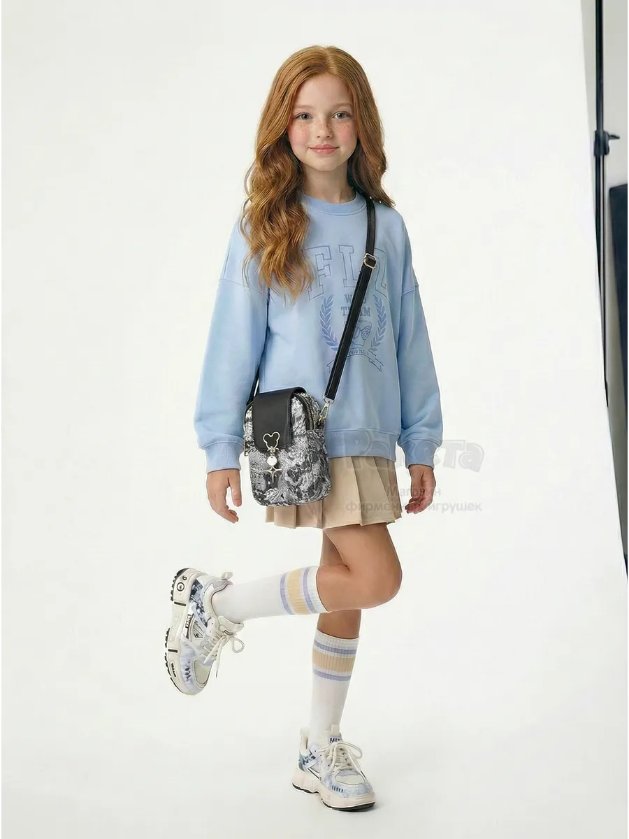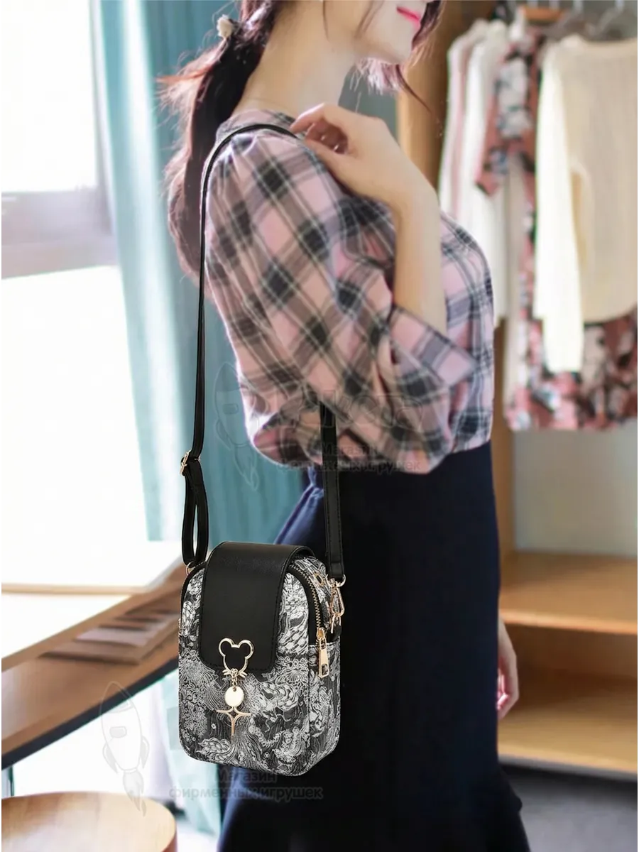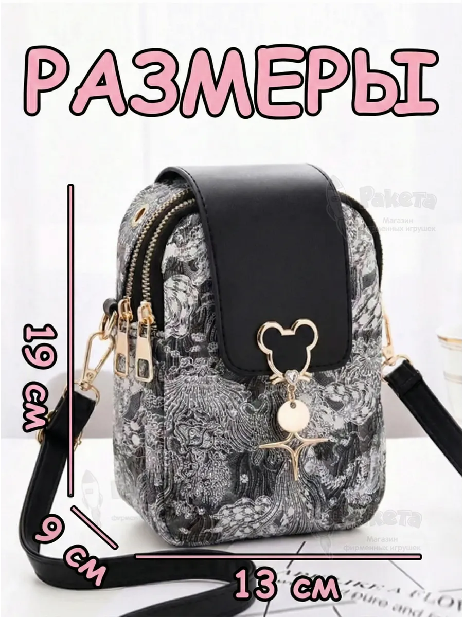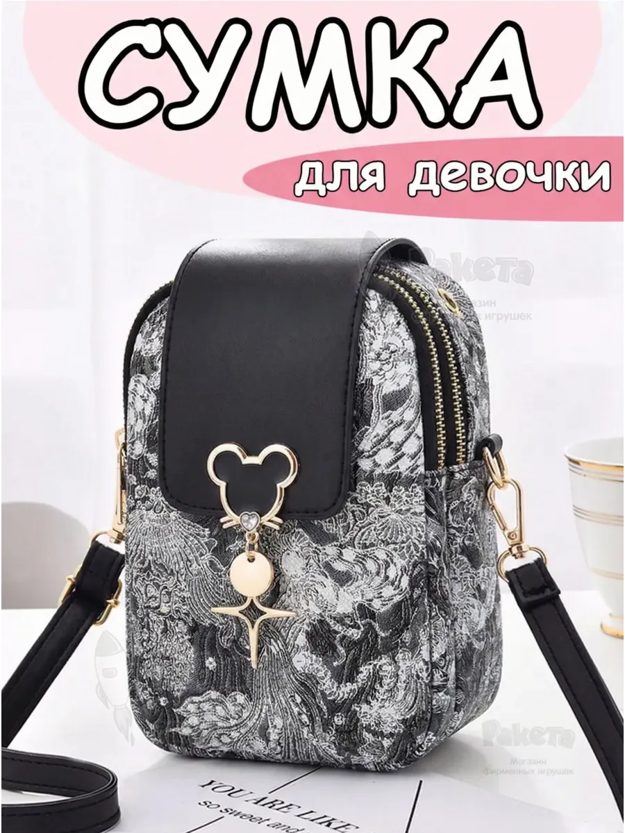 Сумка кросс боди для девочки подростка на плечо черного цвета с узорами и модной фурнитурой. Имеет регулируемый съёмный ремень. Внутри 2 отделения на замке и 1 небольшой карман внутри одного из отделений. Спереди сумочка закрывается магнитом. Есть отверстие для наушников.