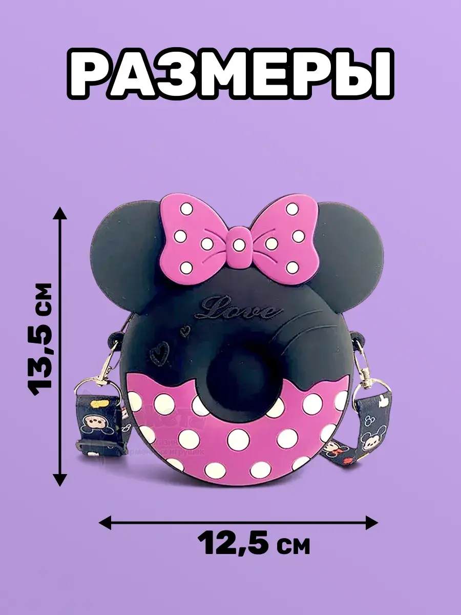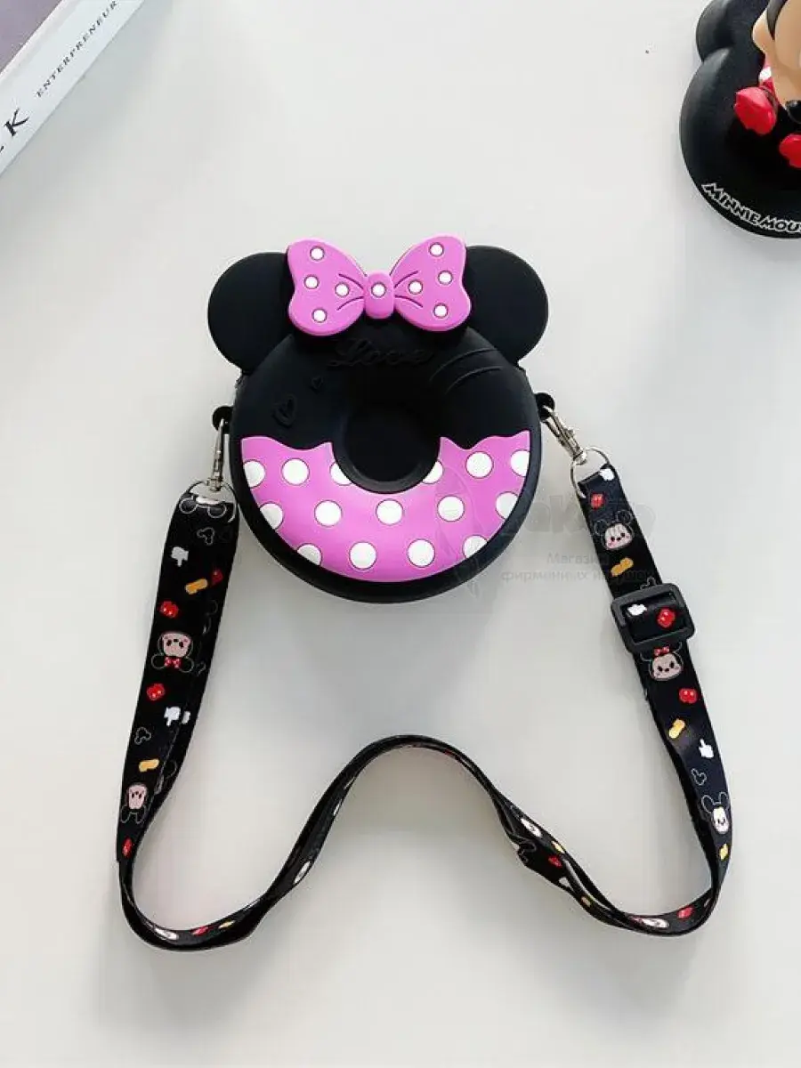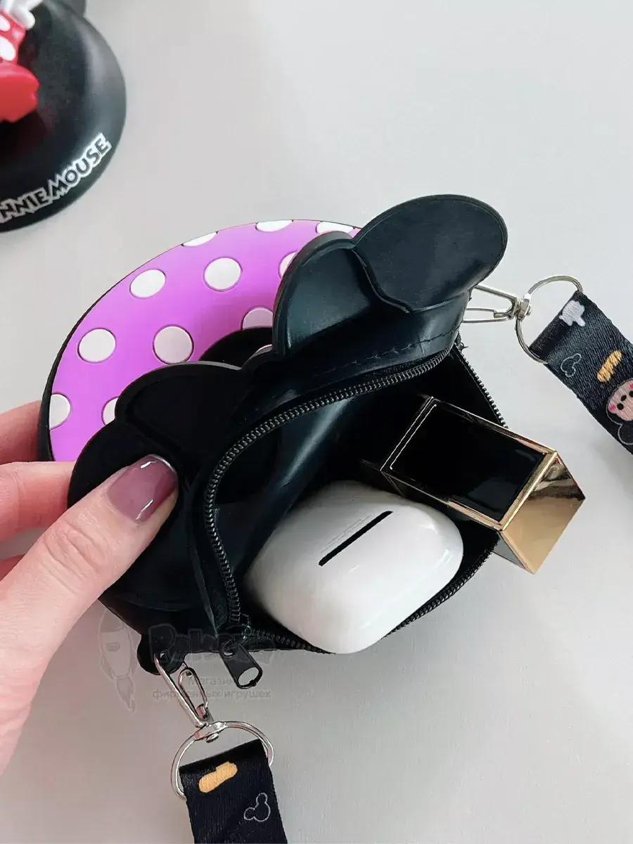 Прелестная силиконовая мини сумка для девочки в стиле Минни Маус. Внутри одно отделение, на молнии. Носится маленькая сумочка на и через плечо.