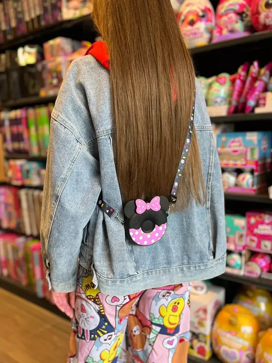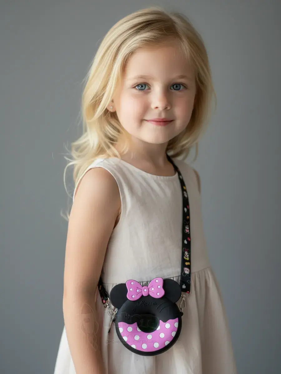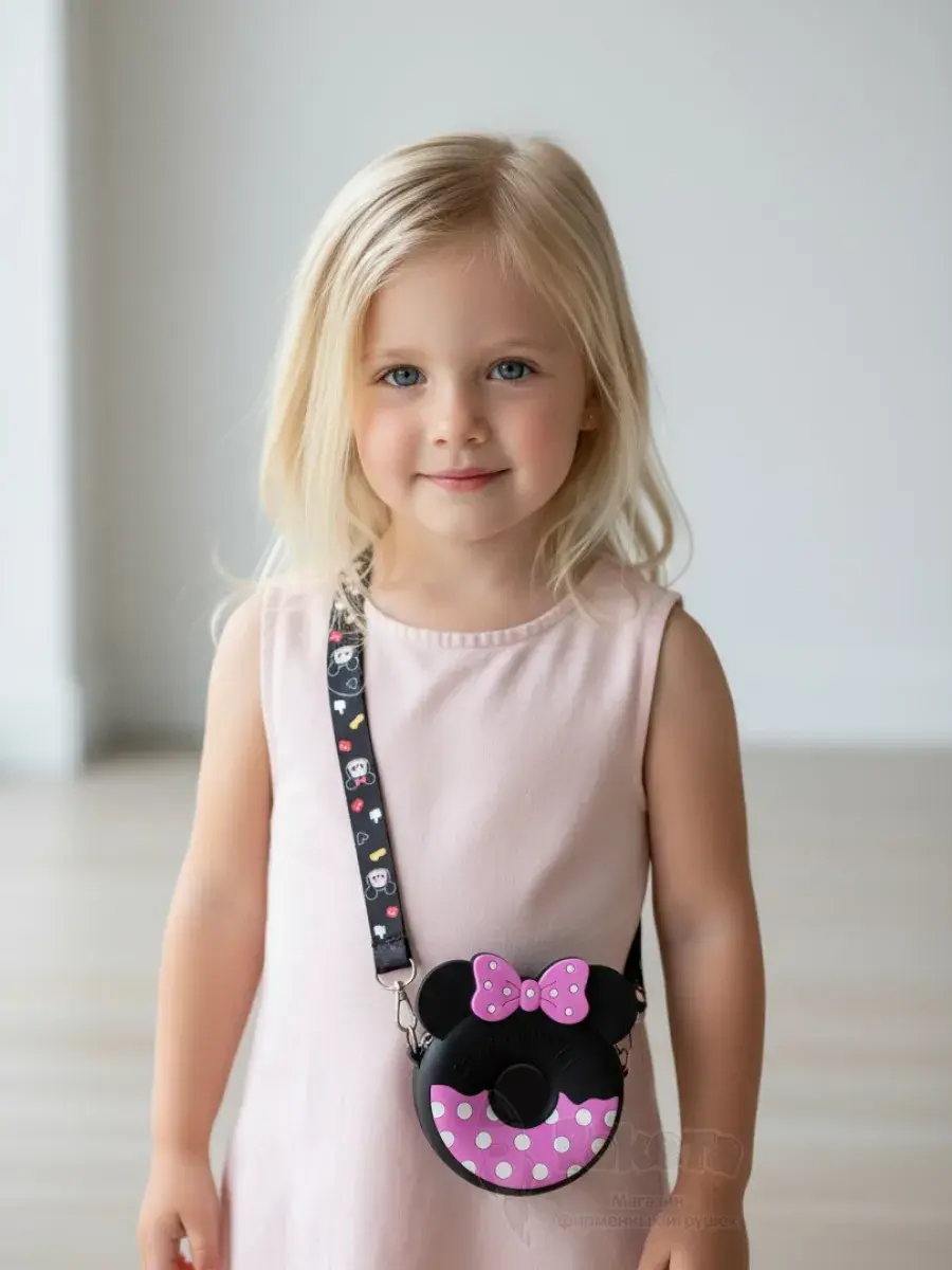 Прелестная силиконовая мини сумка для девочки в стиле Минни Маус. Внутри одно отделение, на молнии. Носится маленькая сумочка на и через плечо.