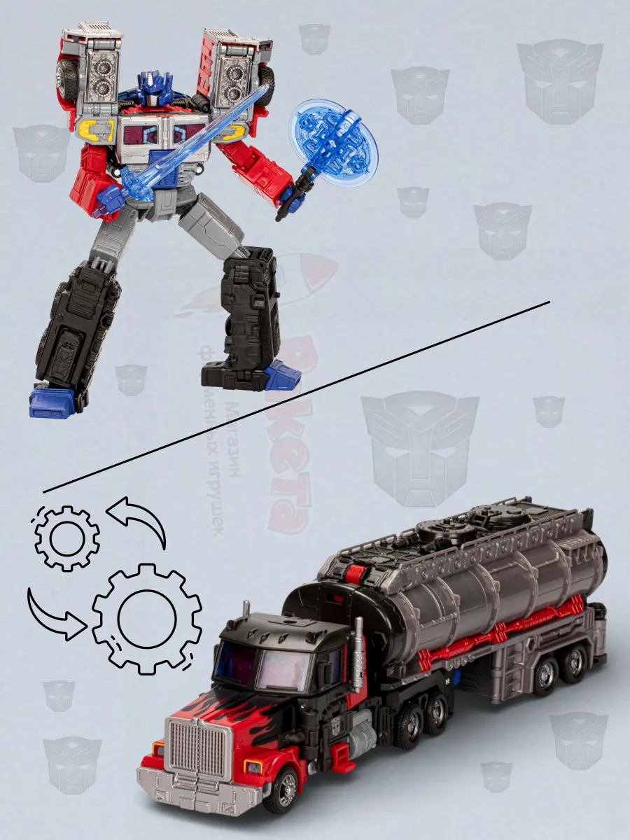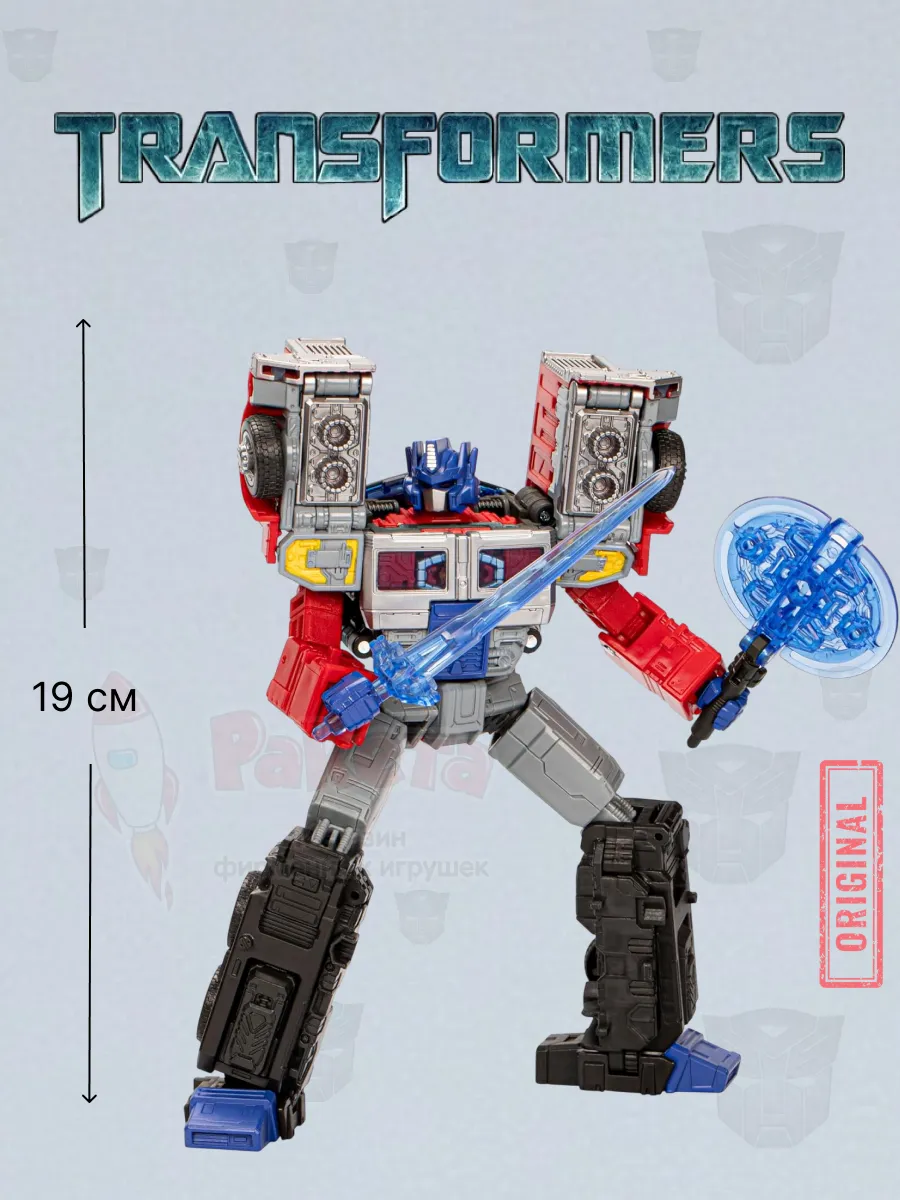 Эта фигурка трансформера Оптимуса Прайма из вселенной G2 поставляется с бластером, энергетическим топором, мечом и матрицей лидерства. Аксессуары крепятся в обоих режимах.