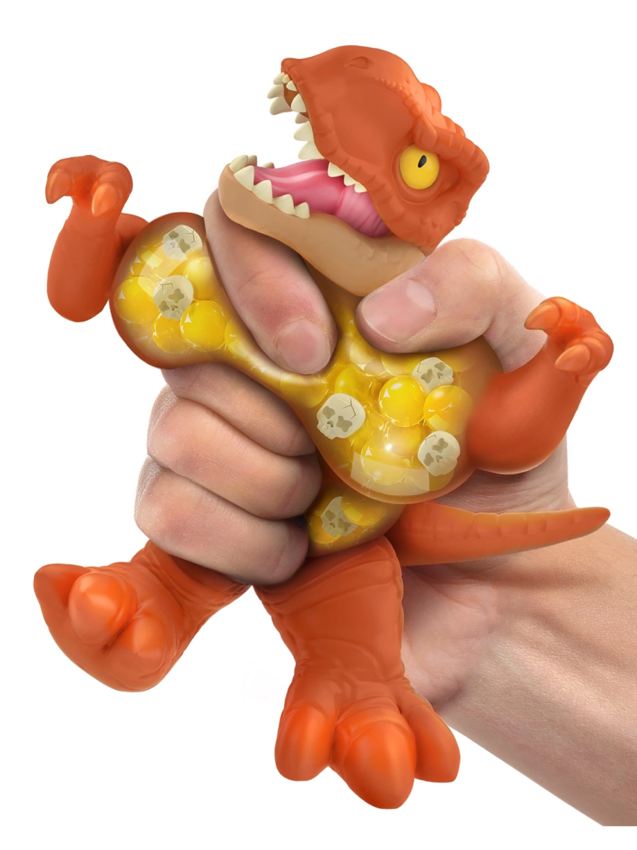 Тянущаяся фигурка Ти Рекс Jurassic World растягивается в 3 раза больше своего тела, затем также легко и быстро возвращается в свой исходный вид, его руки могут растягиваться еще дальше, благодаря гофрированным вставкам. Приятная на ощупь, отлично тянется и скручивается. Фигурка наполнена гидрогелевыми шариками желтого цвета и фигурками в виде черепа. У динозавра есть суперсила - боевые челюсти. В составе только гипоаллергенные материалы. Мыть можно только водой (не использовать мыло и не нагревать).