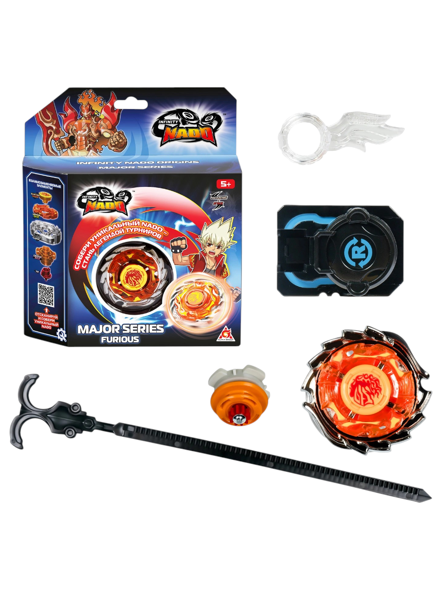 Металлический волчок Infinity Nado Мэйджор Furious Сияющий огонь состоит из пяти частей: аватара Nado, верхнего и атакующего колец, центральной оси и наконечника. Он принадлежит Дону и отличается усиленной атакой, позволяя наносить мощные удары сопернику на арене.