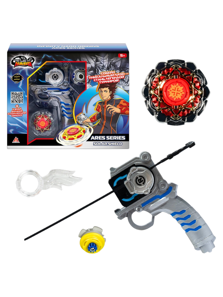 Металлический волчок Infinity Nado Solar shield Гербовый щит принадлежит Аресу Солнца и состоит из пяти частей: аватара Nado, верхнего кольца, двойного атакующего кольца, оси и наконечника. Главным его свойством является защита, что позволяет отражать мощные атаки соперников. Кроме того, волчок оснащён 2 усиленными режимами, позволяющими адаптировать тактику в ходе турнира.