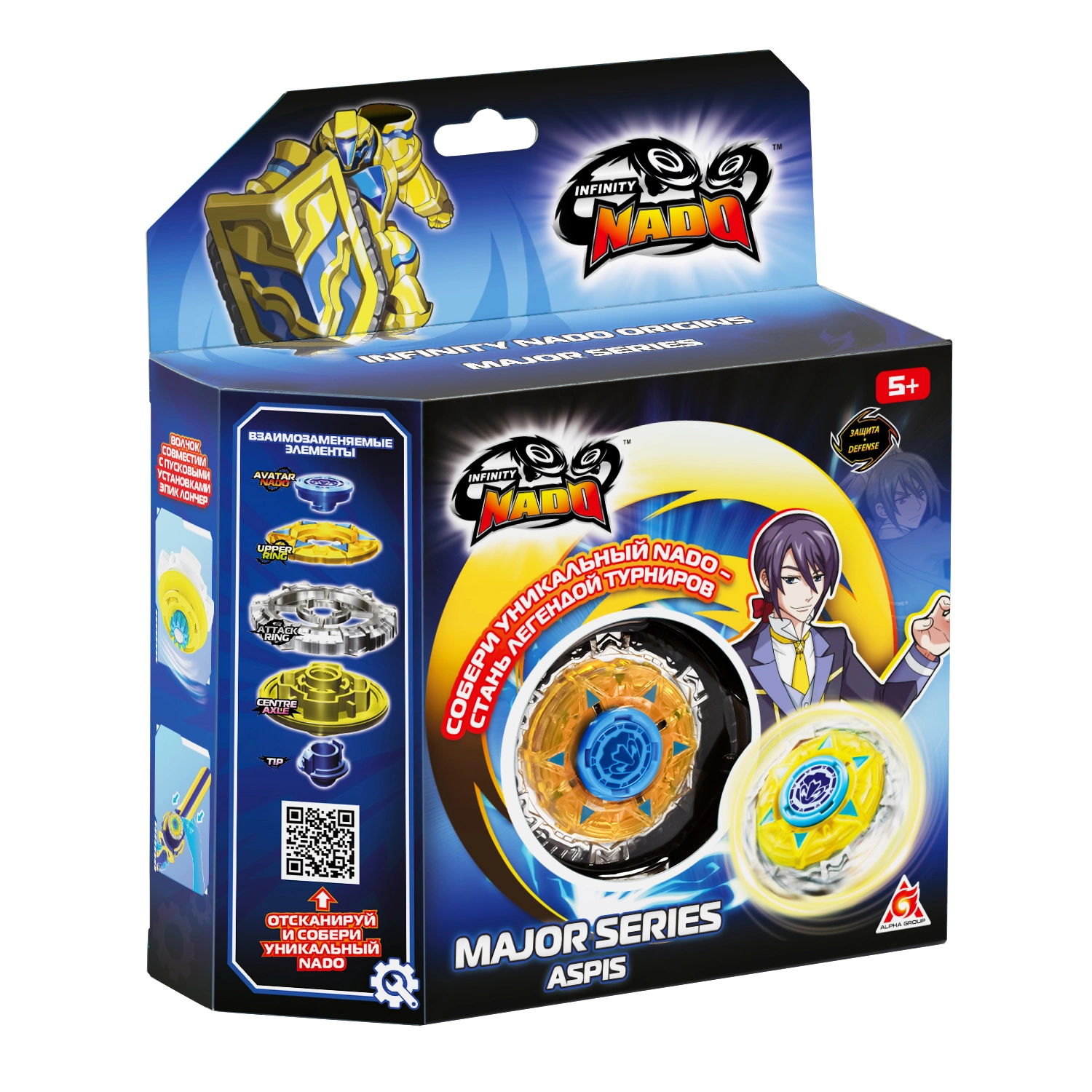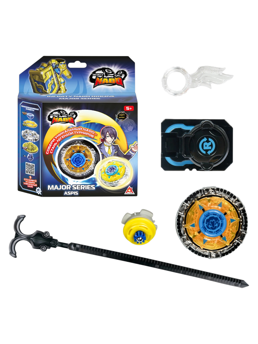 Металлический волчок Infinity Nado Мэйджор Aspis Ослепительный щит состоит из пяти частей: аватара Nado, верхнего и атакующего колец, центральной оси и наконечника. Он принадлежит Дэвису и отличается повышенной защитой, что позволяет отражать мощные атаки соперников.